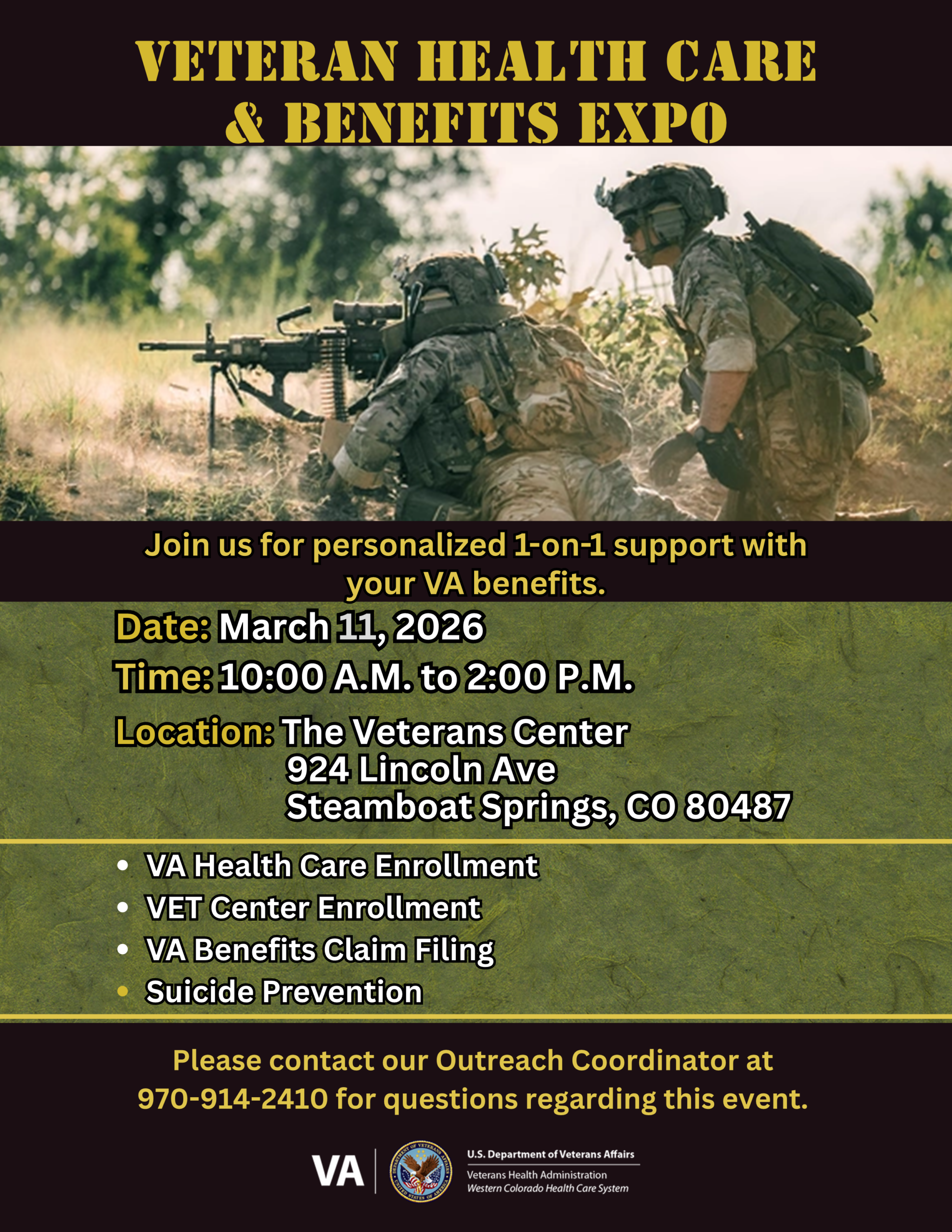 Veterans can receive one-on-one assistance to enroll in VA Health Care, file a service connection claim, and sign up for VET Center Services. Additionally, a representative from our Suicide Prevention Team will be present to discuss SAVE Training and offer further resources on Suicide Prevention.