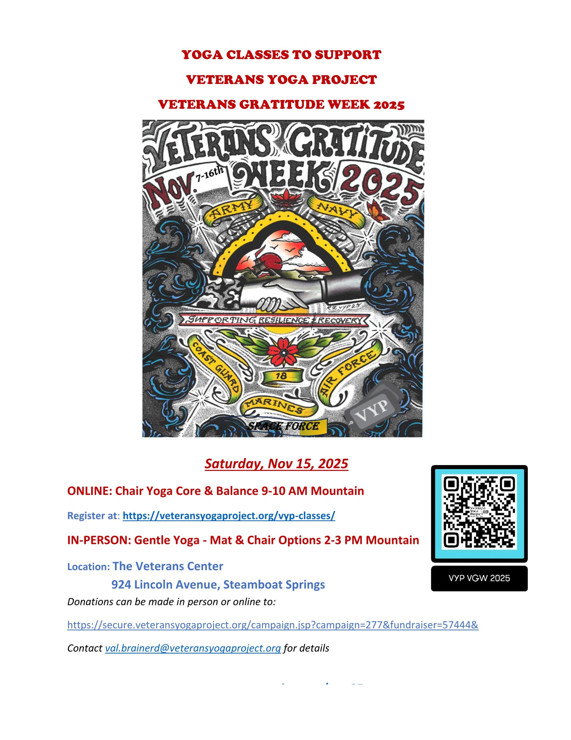 Veterans Yoga Project Fundraising Class – Gentle Yoga – Mat & Chair Options